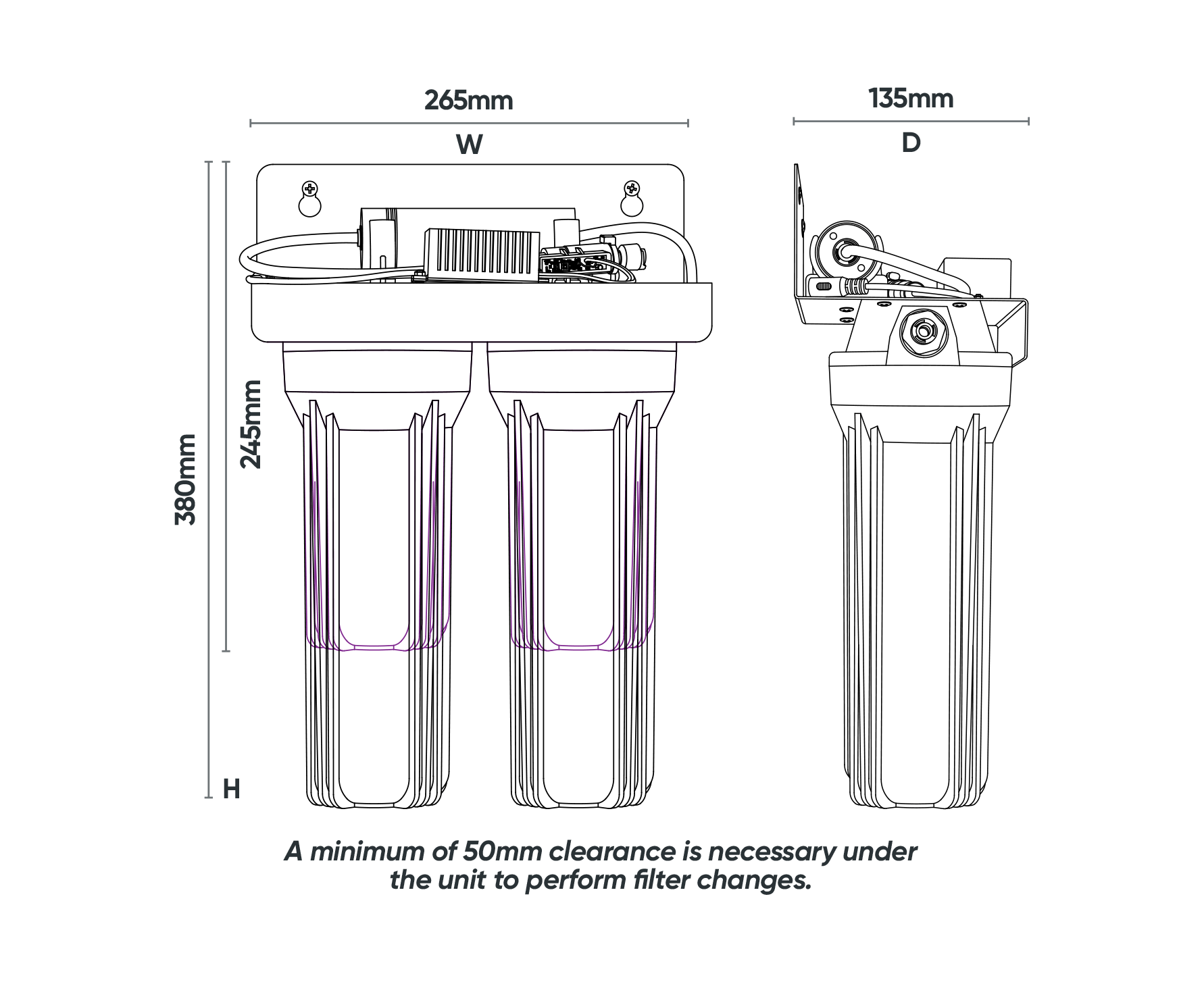 Technical drawing of a dual water filter unit with dimensions: width 265mm, depth 135mm, and height 380mm. A minimum clearance of 50mm under the unit is recommended for filter changes.